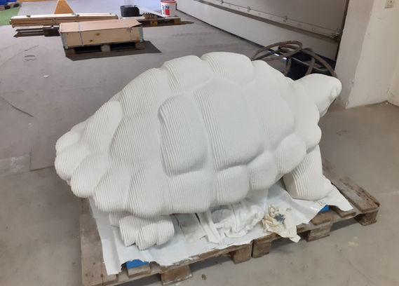 Die Schildkröte wurde aus 3 einzelnen Druckteilen gefertigt. Sie wurde im 2 Schritt komplett ausgegossen und über mehrere Gewindestangen verklebt. Das CAD Modell wurde in einem sculpting Prozess in der Software Z-Brush detail-bearbeitet. Das Objekt ist 1,6m lang und wiegt ca. 1,3 Tonnen.